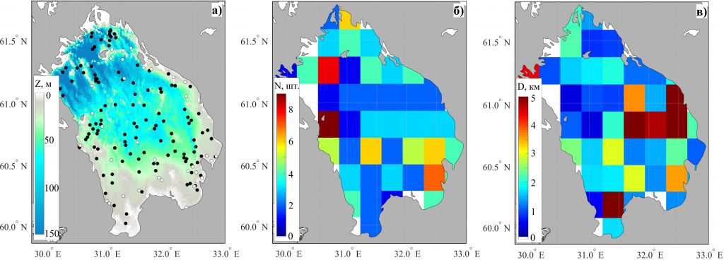 Как видно из рис. 1.4.4а, проявления вихрей в 2019 году по результатам анализа 592 РЛИ регистрировались почти во всех районах (рис. 1.4.4а), при этом чаще всего (9 штук на ячейку) к юго-востоку от острова Коневец (рис. 1.4.4б).  Из 151 структуры, зарегистрированных на 592 РЛИ, 33 проявления имели антициклонический тип, а 118 – циклонический. Средний диаметр за год составил 2,1 км, при этом для циклонов и антициклонов он был 2 и 2,3 км соответственно. Средний диаметр вихрей на ячейку сетки составил более 5 км к востоку от центра озера, а также в бухте Петрокрепость. Более подробно характеристики вихрей за 2019 г. представлены в таблице 1.4.4.