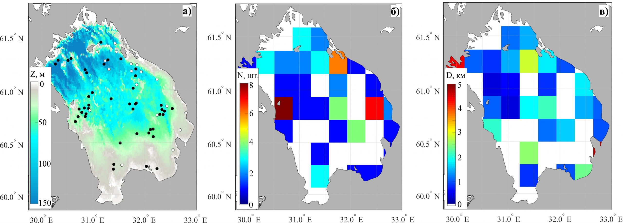 Рис. 1.3.10. Карты топографии Ладожского озера, совмещенные с положениями центров антициклонов (белые круги) и циклонов (черные круги) (а), количества вихрей (б) и их диаметров (в), осредненных на сетку, за октябрь 2016-2022 гг.