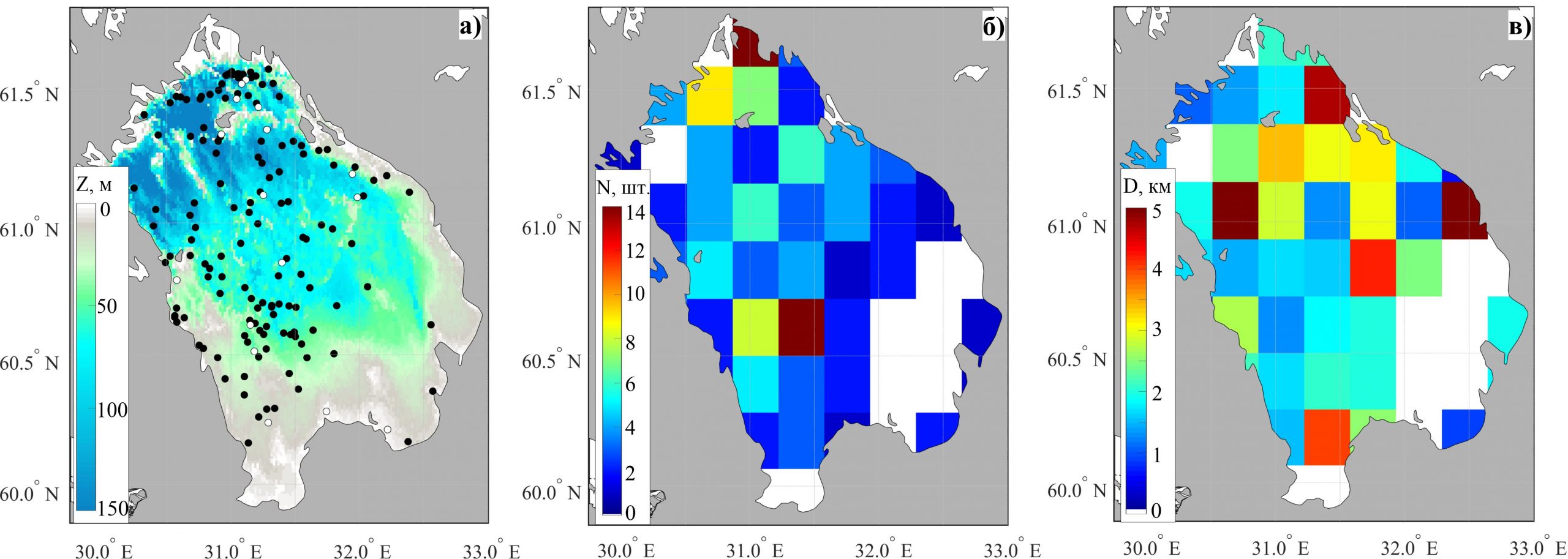 Рис.1.3.9. Карты топографии Ладожского озера, совмещенные с положениями центров антициклонов (белые круги) и циклонов (черные круги) (а), количества вихрей (б) и их диаметров (в), осредненных на сетку, за сентябрь 2016-2022 гг.