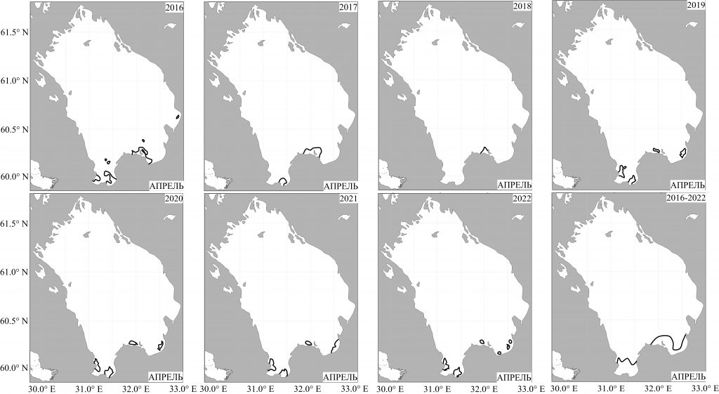 За апрель 2016-2022 гг. (см. рис. 2.3.2) на основе 192 полей температуры поверхности Ладожского озера были проведены среднемесячные положения термобара. Как можно видеть, по спутниковым данным граница основного фронта озера располагается на мелоководье в южной части озера на глубинах 5-20 м. Фронт регистрируется вблизи устья Невы в бухте Петрокрепость и недалеко от устья реки Волхов. Площадь термоактивной стратифицрованной зоны не превышает 550 км2. Значительных межгодовых вариаций положений не зарегистрировано.