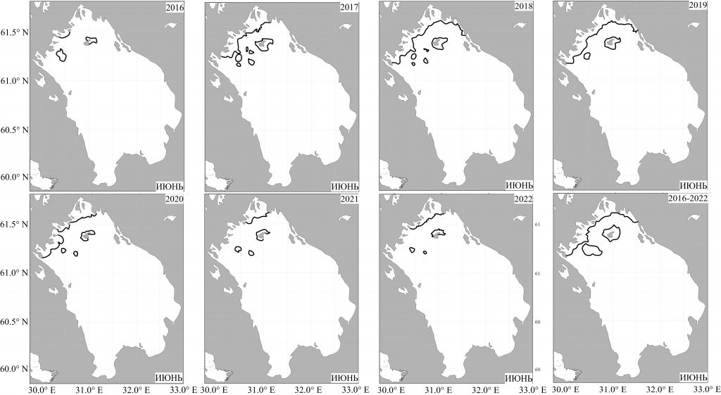 За июнь 2016-2022 гг. (см. рис. 2.3.3) на основе 419 полей температуры поверхности Ладожского озера были проведены среднемесячные положения термобара. Граница основного фронта располагается в северной глубоководной части озера вблизи арх. Валаам и Западный арх. Средняя площадь термоактивной зоны достигает 15580 км2 (табл. 2.3.4).